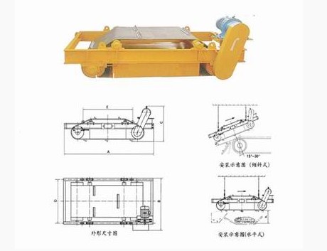 被皮帶輸送機(jī)輸送的散狀物料,通過安裝在尾部支架上的磁選機(jī)(即旋轉(zhuǎn)的直流磁鐵)時,物料中的鐵磁雜物被吸,由棄鐵膠帶將鐵磁雜物拽至電動滾筒卸下,達(dá)到自動除鐵的目的。